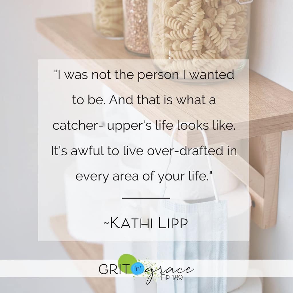 Kathi: I think the best example is that I would put like $2 or $3 worth of gas in my car. Right? Because I was a 20 something, I had better things to do with my money than gas, like that’s the most boring thing you can spend money on, right? Except for insurance, which I didn’t have, by the way. Both of those super boring, but – so I would do that because I had one of those magical cars that actually went pretty far at a few dollars worth of gas. But I kept pushing how far could I go and I, I would end up not just pushing my luck but pushing my car. And I was also the person who – I, I took out credit cards. Like I had a Nordstrom card and I got it in the mail and I was so excited. My mom’s friends were like “She knows she has to pay that off, right?” Like, abstractly, I did know it. But in my heart, I really didn’t. It was just – I was borrowing ahead on everything, on time, on money, on energy. You know, I’d stay up till three in the morning because that was the fun thing to do, even though I needed to be at work at eight o’clock, you know. I borrowed ahead on every aspect of my life and I was constantly trying to catch up. And here’s what I did. Not only did I try to catch up, I would blame other people. And I would blame other circumstances. And then it got so bad I was lying about why I was late to places, why I was out of money, and I got to a point where I just, I didn’t like myself in my 20s. You know, I was not, I was not the person I wanted to be. And that is what a catcher uppers life looks like, eventually, because you never catch up. Because you never can. You know, you may get lucky once or twice, but it’s it’s an awful way to live. You overdraft on every area of your life.